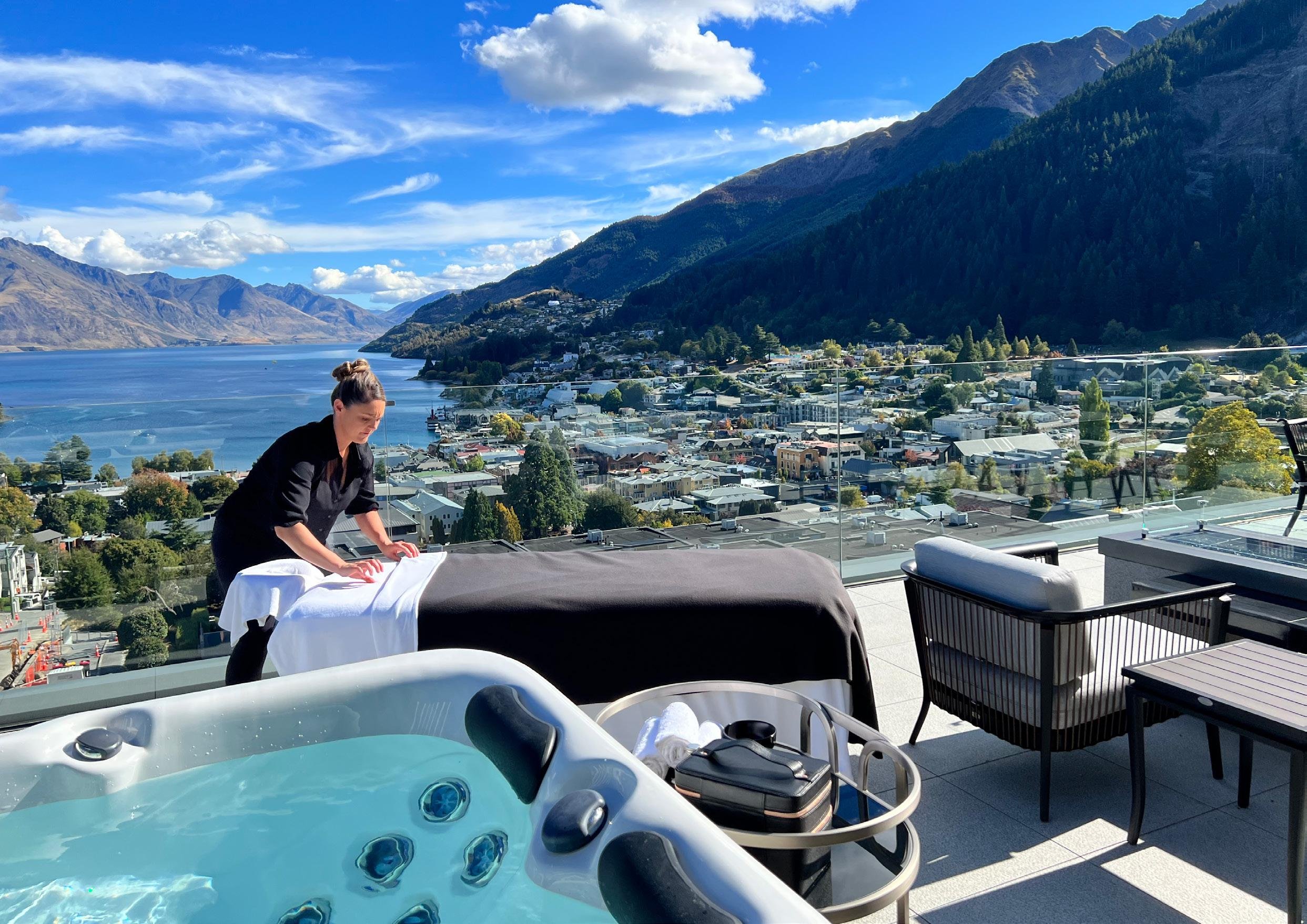 A five-star luxury boutique hotel located above Lake Wakatipu in Queenstown. It offers spacious suites with private terraces, spa pools, and panoramic views of the lake and mountains. The hotel is known for its personalised service, fine dining restaurant, and exclusive, high-end accommodation experience.