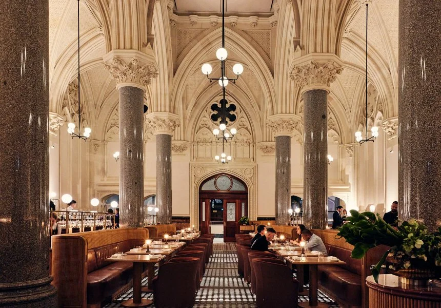 There’s wow-factor from every angle at Reine & La Rue, the ambitious, double-venue dining room and bar within the neo-gothic 1890s Melbourne Stock Exchange from the Nomad Group. Inside, granite columns support vaulted sandstone arches above the 135-seat dining room. Either side of the room, white-jacketed staff behind long Italian red marble bars sling cocktails and seafood.